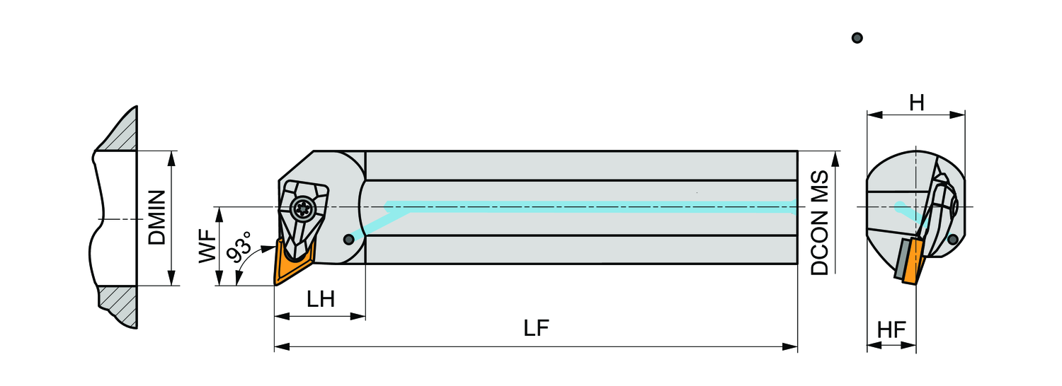 Double clamp boring bar for holding a 55° rhombus negative insert with an inscribed circle diameter of 3/8'', 3/16'' thick (ANSI designation DN.. 33. ), right hand 93° end cutting with off-set shank, steel with coolant hole, 1'' diameter x 12'' long for internal chamfering, taper boring, single and multi-directional copy boring and longitudinal boring with and without shoulder