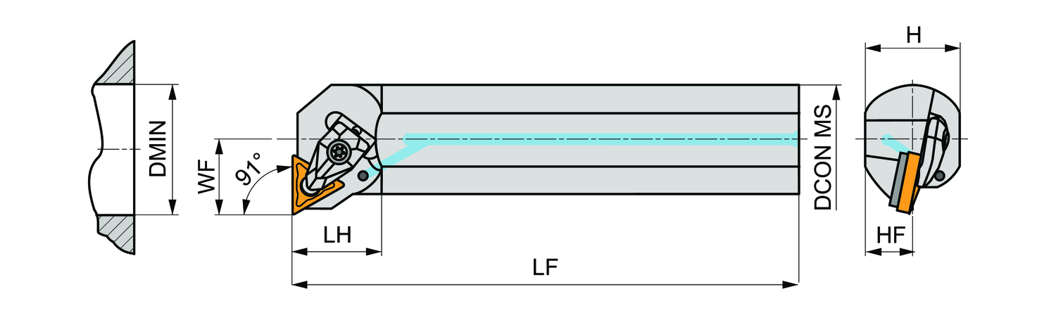 Double clamp boring bar for holding a triangular negative insert with an inscribed circle diameter of 3/8'', 3/16'' thick (ANSI designation TN.. 33. ), right hand 90° end cutting with off-set shank, steel with coolant hole, 1'' diameter x 12'' long for internal chamfering, taper boring and longitudinal boring without shoulder