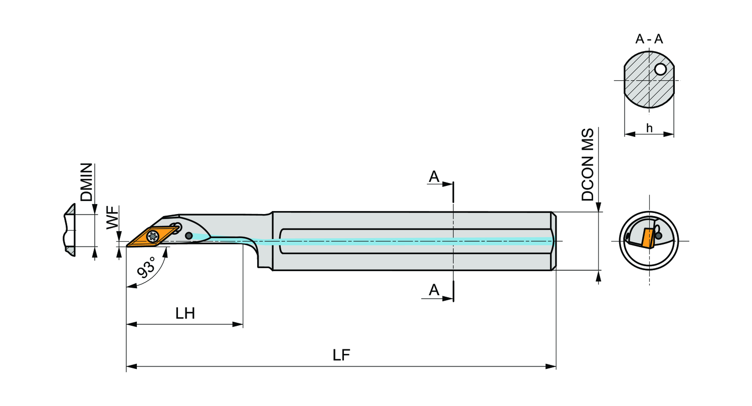Screw clamp boring bar for holding a 35° rhombus positive insert with an inscribed circle diameter of 6.35mm, 3.18mm thick (ISO designation VB.. 1103.. ), right hand 93° side cutting with off-set shank, steel with coolant hole, 20mm diameter x 200mm long for face copy turning