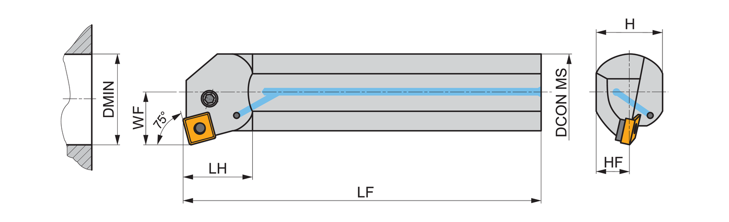Lever lock boring bar for holding a square negative insert with an inscribed circle diameter of 12.7mm, 4.76mm thick (ISO designation SN.. 1204.. ), right hand 75° end cutting with off-set shank, steel with coolant hole, 32mm diameter x 250mm long for taper boring and longitudinal boring without shoulder