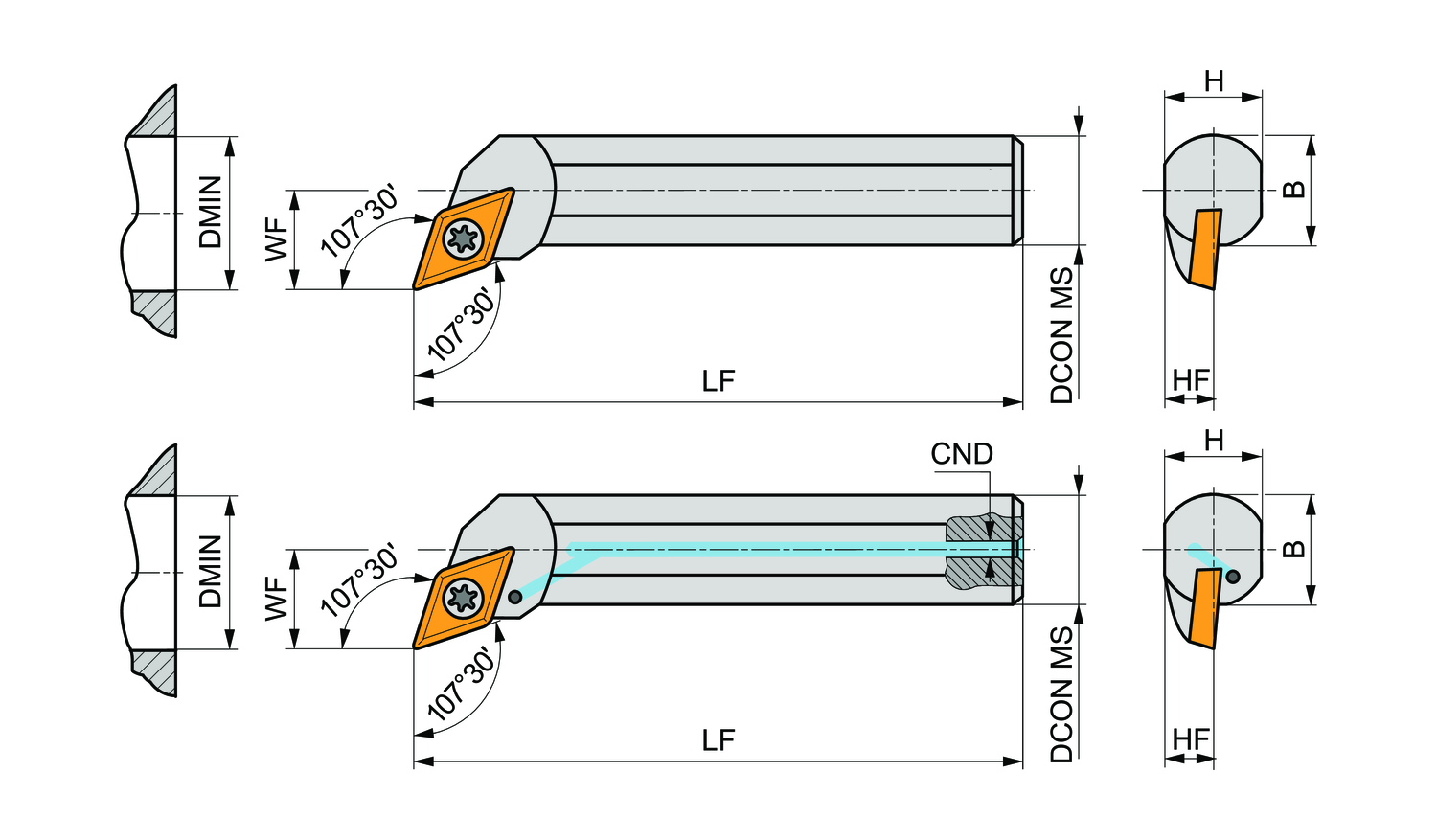 Screw clamp boring bar for holding a 55° rhombus positive insert with an inscribed circle diameter of 9.525mm, 3.97mm thick (ISO designation DC.. 11T3.. ), right hand 107°30' end cutting with off-set shank, steel with coolant hole, 32mm diameter x 250mm long for taper boring and longitudinal boring with and without shoulder