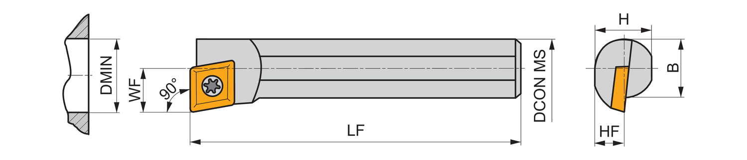 Screw clamp boring bar for holding a 80° rhombus positive insert with an inscribed circle diameter of 6.35mm, 2.38mm thick (ISO designation CC.. 0602.. ), right hand 90° end cutting with off-set shank, steel without coolant hole, 10mm diameter x 100mm long for taper boring and longitudinal boring without shoulder