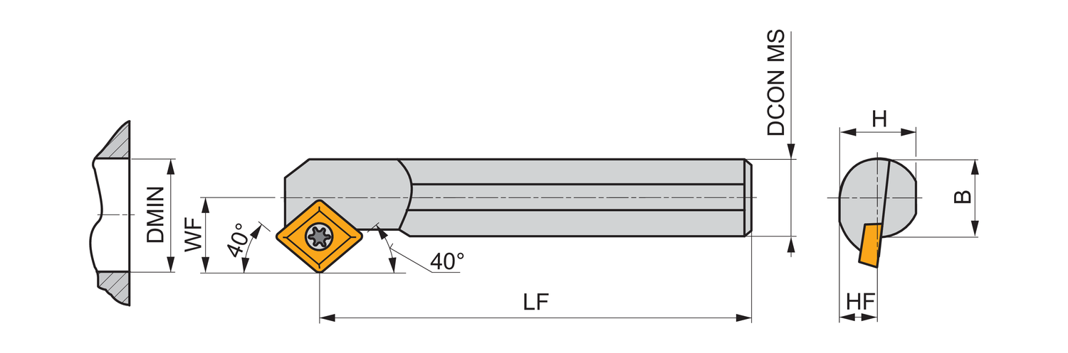Screw clamp boring bar for holding a 80° rhombus positive insert with an inscribed circle diameter of 6.35mm, 2.38mm thick (ISO designation CC.. 0602.. ), left hand special tool style, steel without coolant hole, 16mm diameter x 180mm long for