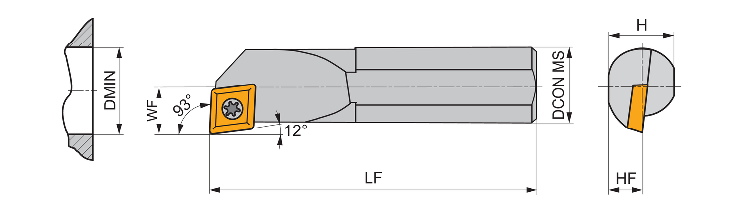 Screw clamp boring bar for holding a 75° rhombus positive insert with an inscribed circle diameter of 7.94mm, 3.18mm thick (ISO designation EC.. 0803.. ), right hand 93° end cutting with off-set shank, steel without coolant hole, 16mm diameter x 200mm long for taper boring and longitudinal boring with and without shoulder