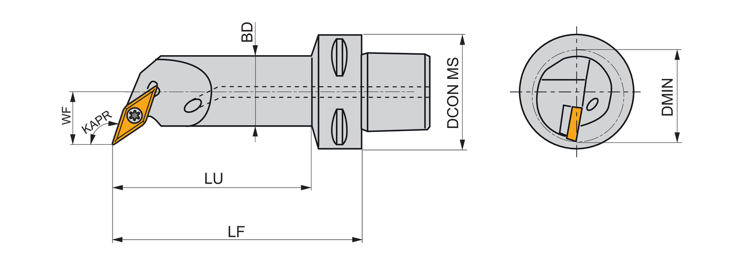 Screw clamp boring bar for holding a 35° rhombus positive insert with an inscribed circle diameter of 9.525mm, 4.76mm thick (ISO designation VB.. 1604.. or VC.. 1604.. ), right hand 107°30' end cutting with off-set shank according to ISO 26623 (Polygon Shank Coupling) size C4, with 18mm funtional width and 90mm protruding length for single and multi-directional copy boring
