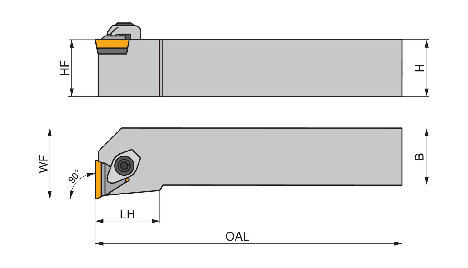 Top clamp turning tool for holding a triangular positive insert with an inscribed circle diameter of 9.525mm, 3.18mm thick (ISO designation TP.. 1603... ), right hand 90° end cutting with off-set shank, 25mm tool height x 25mm width x 150mm long for face turning without shoulder
