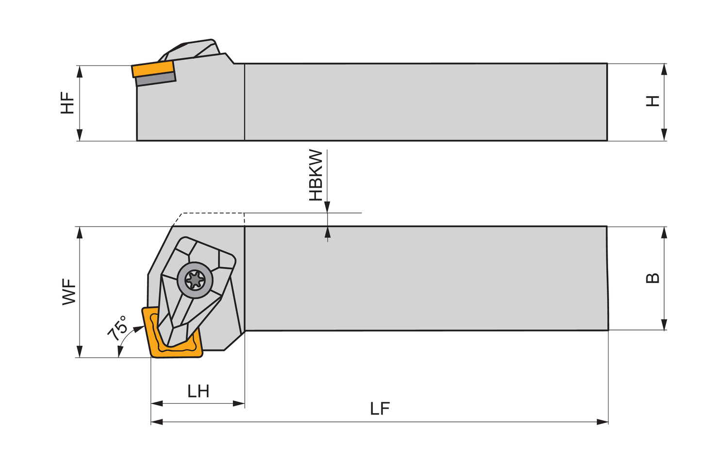 Double clamp turning tool for holding a 80° rhombus negative insert with an inscribed circle diameter of 1/2'', 3/16'' thick (ANSI designation CN.. 43. ), right hand 75° end cutting with off-set shank, 1'' tool height x 1'' width x 6'' long for face turning without shoulder