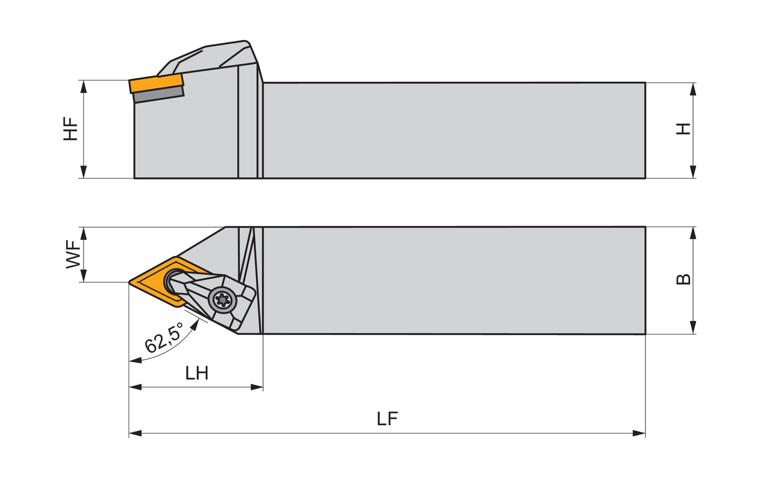 Double clamp turning tool for holding a 55° rhombus negative insert with an inscribed circle diameter of 1/2'', 3/16'' thick (ANSI designation DN.. 43. ), neutral hand 62.5°, left and right side cutting, 1'' tool height x 1'' width x 6'' long for single and multi-directional copy turning
