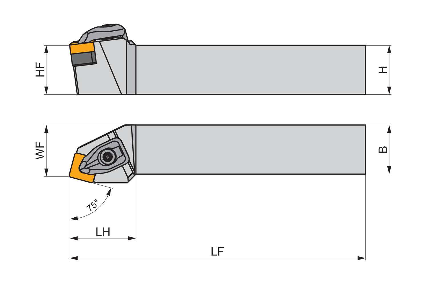 Double clamp turning tool for holding a square negative insert with an inscribed circle diameter of 3/4'', 1/4'' thick (ANSI designation SN.. 64. ), left hand 75° side cutting with off-set shank, 1.1/2'' tool height x 1.1/2'' width x 6'' long for taper turning and longitudinal turning without shoulder