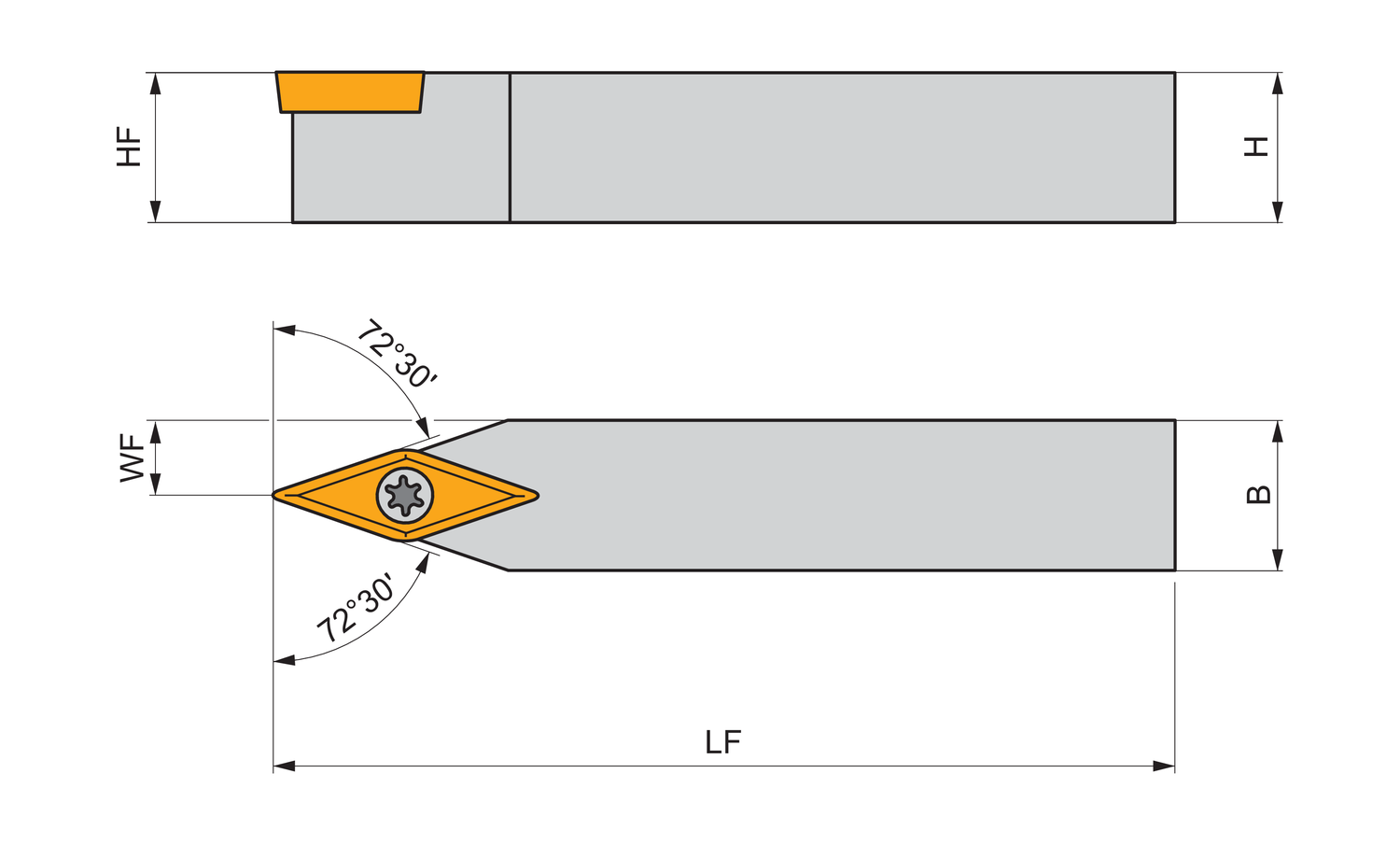 Screw clamp turning tool for holding a 35° rhombus positive insert with an inscribed circle diameter of 7.94mm, 3.18mm thick (ISO designation VC.. 1303.. ), neutral hand 72°30' side cutting with straight shank, 12mm tool height x 12mm width x 160mm long for taper turning, single and multi-directional copy turning and longitudinal turning without shoulder