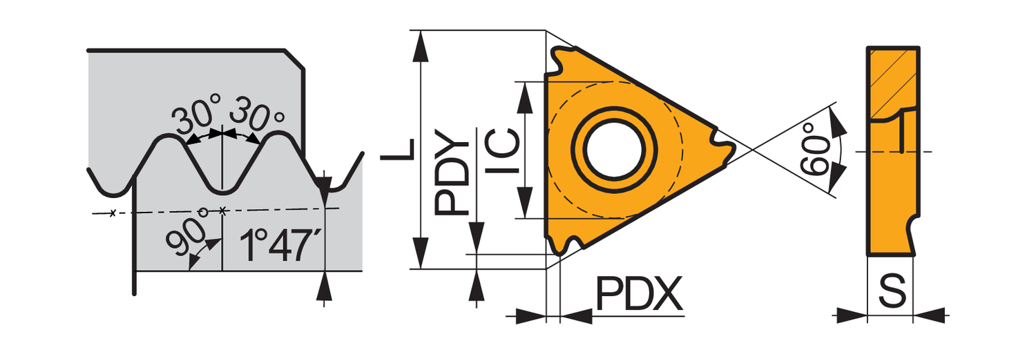 Single-sided threading insert, triangular with an inscribed circle diameter of 9.525mm, for right hand cutting of API internal threads with 8TPI, T8030 PVD coated fine grained WC-Co carbide within ISO-grade ranges P25-P40/M20-M35 and K20-K40 for machining of steel, stainless-steel and cast-iron