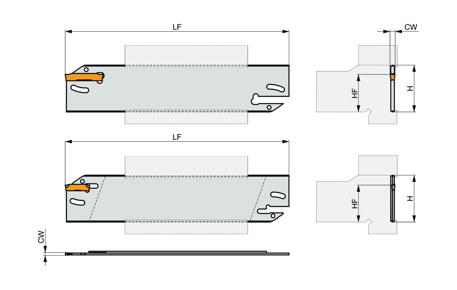 Spring clamp parting and grooving tool blade for holding a 25mm double ended insert with 2-2.5mm cutting width (designation GL2-D… ), tool style assembly with 32-DU.. for a maximum grooving depth of 50mm, tool blade height 32mm and length 150mm for parting-off and tube parting-off
