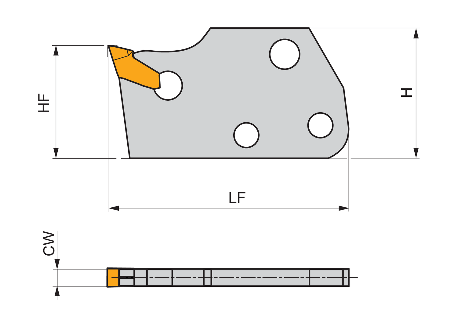 Spring clamp parting and grooving tool blade for holding a single ended insert with 4mm cutting width (designation LFMX 4.1-. ), tool style assembly with MS-EN.. (KMP)(S), right or left hand side, insert parallel to the shank for a maximum grooving depth of 25mm, for shallow and deep radial grooving, parting-off and tube parting-off