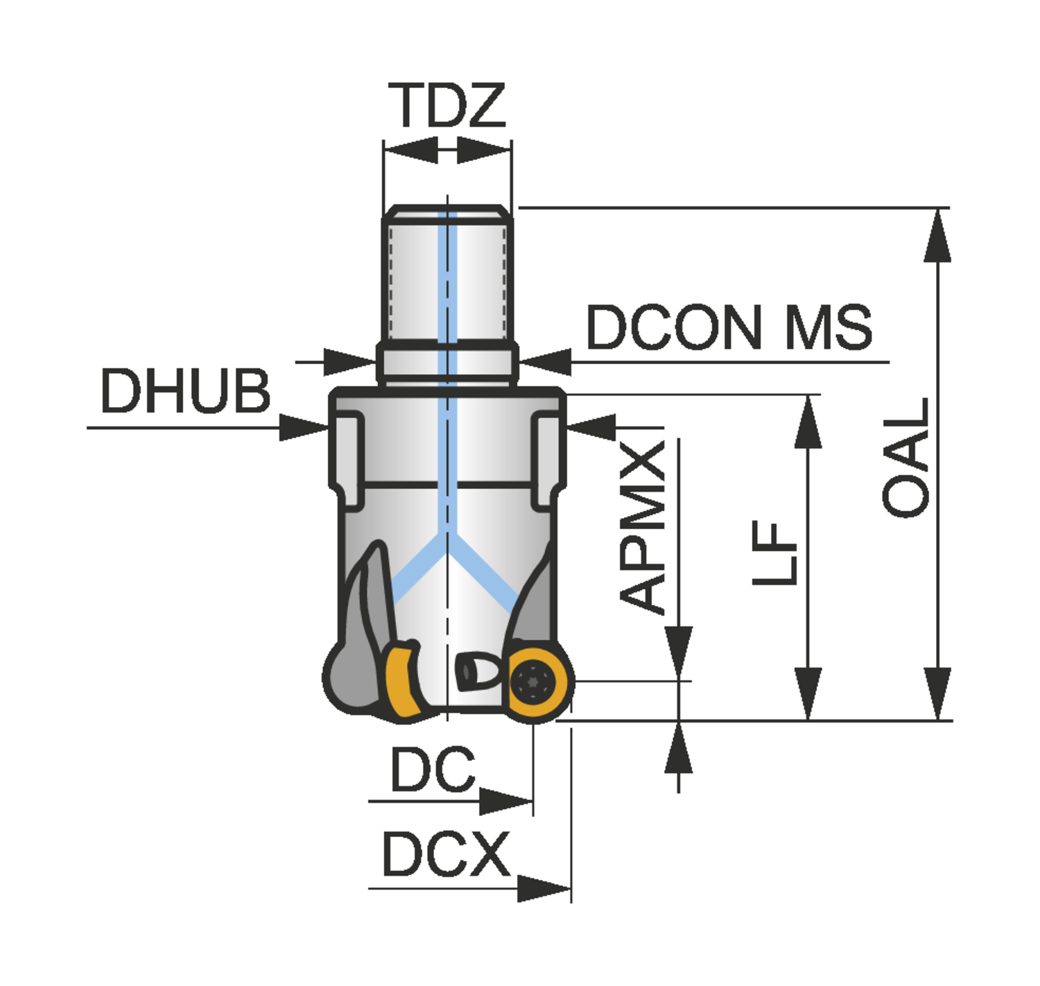 Copy face mill with double negative geometry which utilises 2 off RCMT 10T3MO.. single-sided inserts, cutting diameter 1.000'' with M12 threaded shank for standard modular tool-holders, 1.260'' protrusion length, through coolant for face milling, copy milling, ramping, helical milling and plunge milling with a maximum depth of cut of .197''