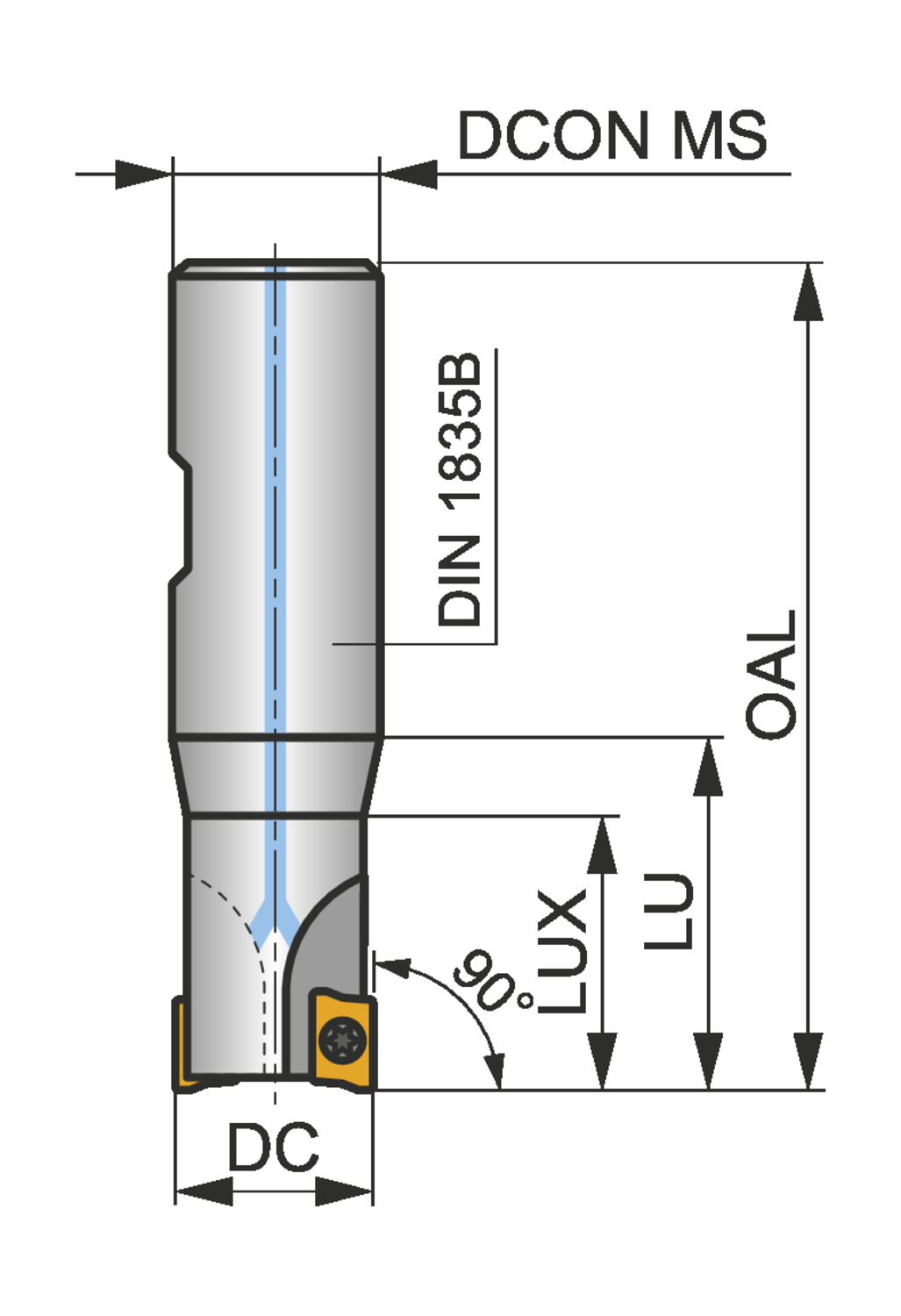 Shoulder mill with positve/negative geometry which utilises 3 off ADMX 1606.. or ADEX 1606.. single-sided inserts, cutting diameter 1.500'' with 90° approach angle and 1.250'' Weldon shank according to DIN 1835B, 1.600'' functional and 4.350'' overall length, through coolant for copy milling, shallow shoulder milling, shallow slot milling, ramping, helical milling, plunge milling and progressive plunge milling with a maximum depth of cut of .512''