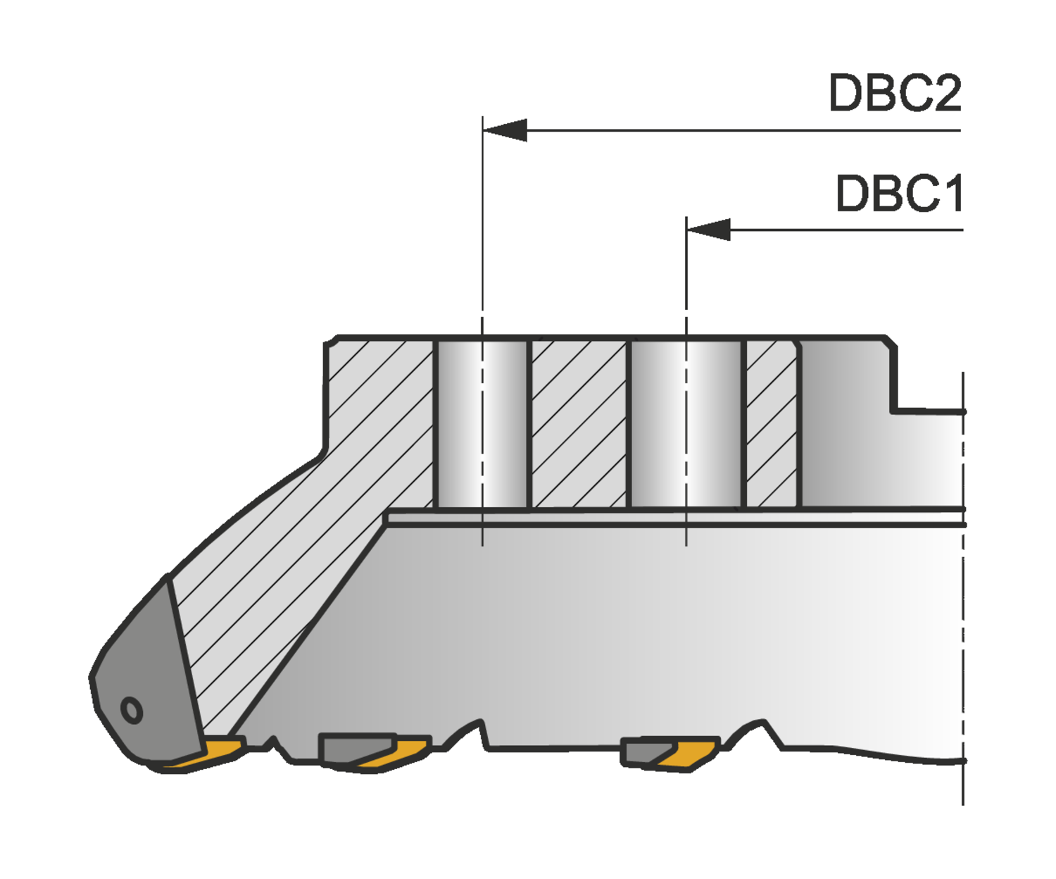 Face mill with double negative geometry which utilises 8 off PNMU 1308DN.. or PNMQ 1308DN.. double-sided inserts, cutting diameter 160 to maximum 175.8mm with 57° approach angle and 40mm connection bore according to DIN 8030-C, 63mm protrusion length for face milling with a maximum depth of cut of 10.0mm