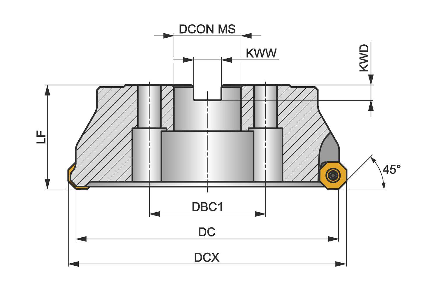 Face mill with positve/negative geometry which utilises 9 off OD.. 0605ZZ.. or RP.. 1505MO.. single-sided inserts, cutting diameter 160 to maximum 169.5mm with 45° approach angle and 40mm connection bore according to DIN 8030-C, 63mm protrusion length and differential pitch for face milling and chamfering with a maximum depth of cut of 3.1 (8.6)mm