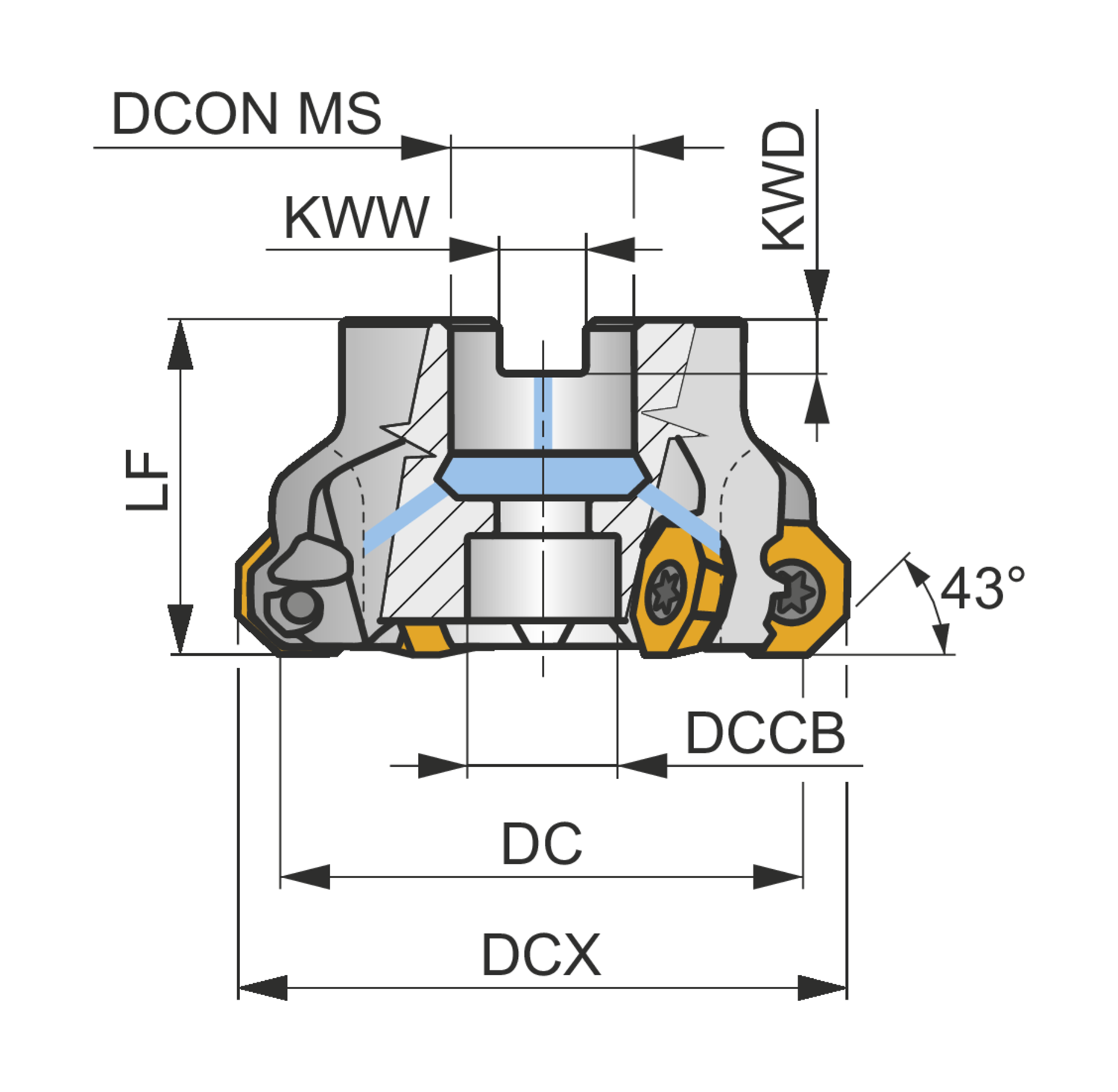 Face mill with double positive geometry which utilises 4 off OEHT 0604AE.., REHT 1604M0.. or XEHT 0604AE.. single-sided inserts, cutting diameter 2.000 to maximum 2.402'' with 43° approach angle and .750'' connection bore according to DIN 8030-A, 1.575'' protrusion length, through coolant for face milling and chamfering with a maximum depth of cut of .130 (.390)''