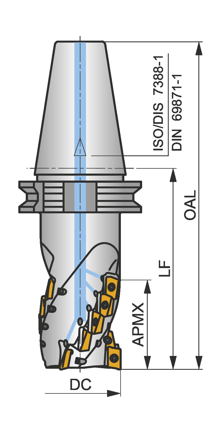 Shoulder mill which utilises 3 off ADMX 1606.. or ADEX 1606.. single-sided inserts, cutting diameter 2.000'' with 90° approach angle and CAT 50 taper shank according to ANSI B5.50, 3.15'' overall length for copy milling, shallow shoulder milling, shallow slot milling, ramping, helical milling, plunge milling and progressive plunge milling