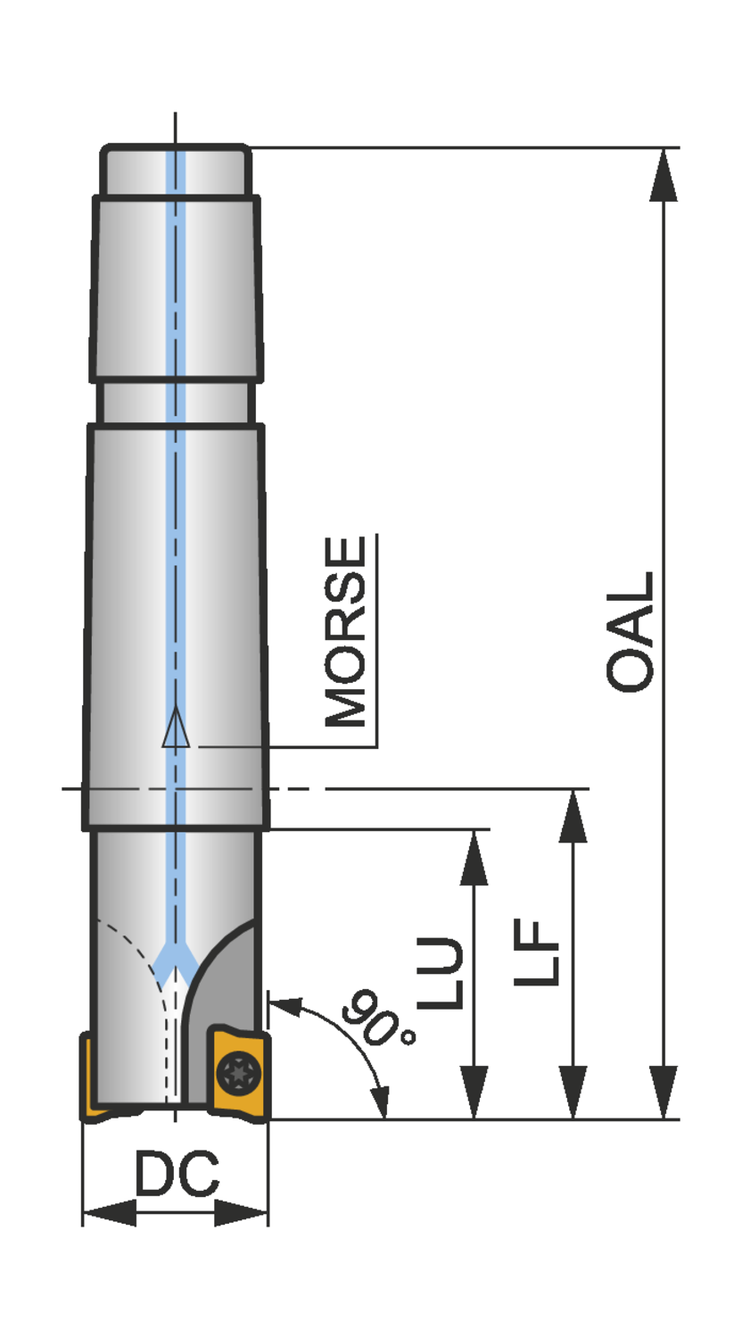 Shoulder mill with positve/negative geometry which utilises 3 off ADMX 11T3.. or ADEX 11T3.. single-sided inserts, cutting diameter 20mm with 90° approach angle and MT 3 morse taper shank according to DIN 228-1A, 30mm functional and 116mm overall length, through coolant for copy milling, shallow shoulder milling, shallow slot milling, ramping, helical milling, plunge milling and progressive plunge milling with a maximum depth of cut of 9.0mm