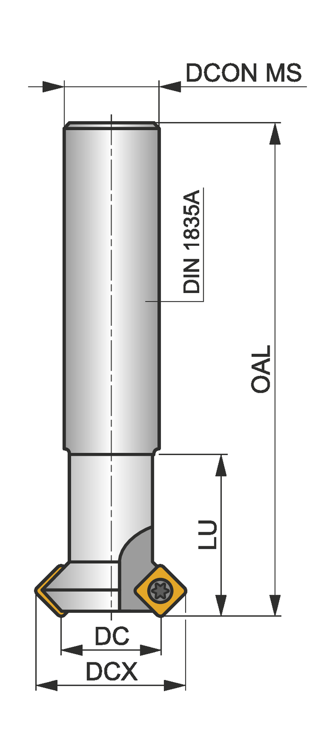 Chamfer mill with double negative geometry which utilises 3 off SDEW 0903.. or SDEX 0903.. single-sided inserts, cutting diameter 25 to maximum 37mm with 45° approach angle and 25mm parallel shank according to DIN 1835A, 200mm overall length for chamfering with a maximum depth of cut of 8.0mm