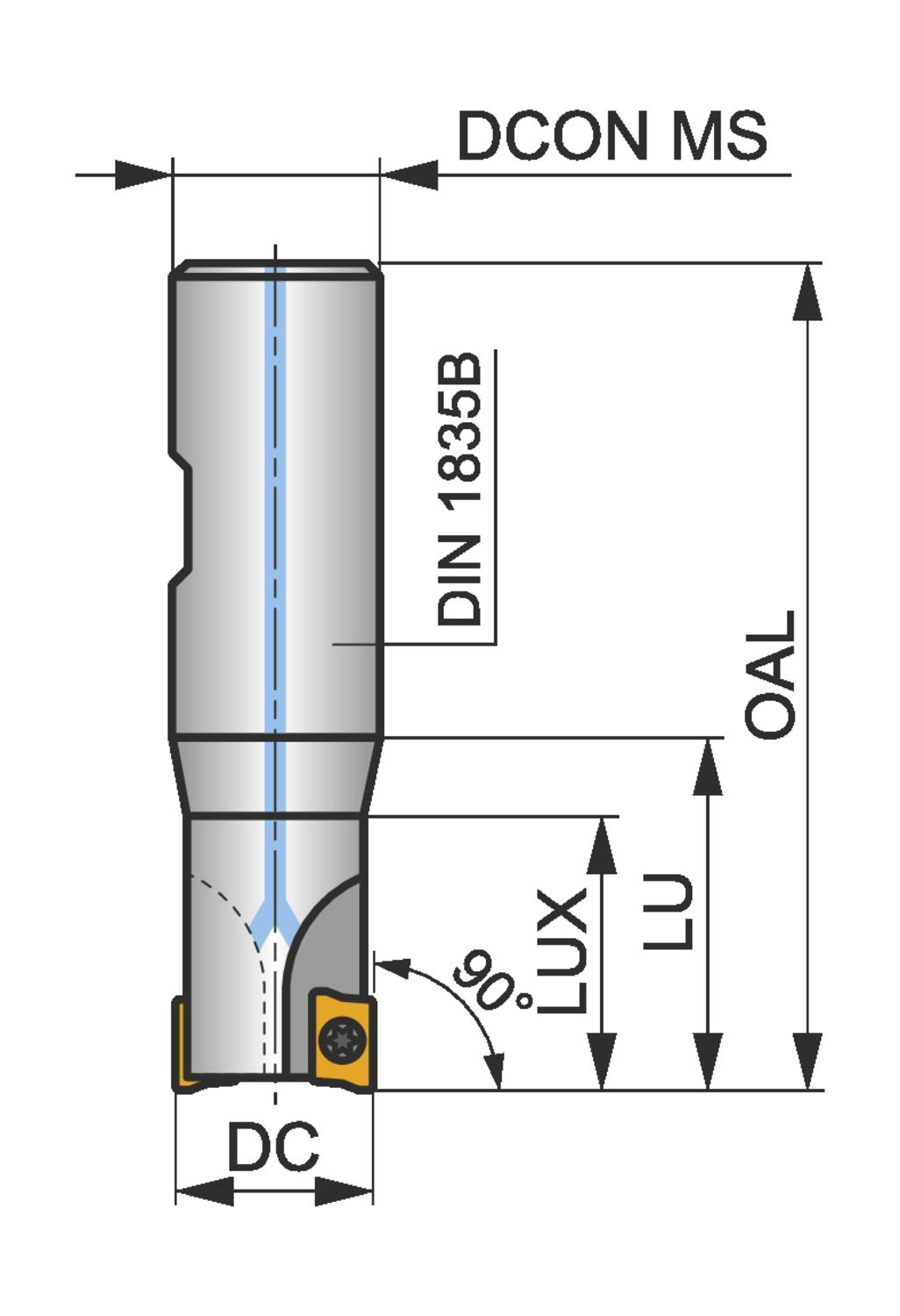 Shoulder mill with positve/negative geometry which utilises 4 off ADMX 11T3.. or ADEX 11T3.. single-sided inserts, cutting diameter 32mm with 90° approach angle and 32mm Weldon shank according to DIN 1835B, 42mm functional and 102mm overall length, through coolant for copy milling, shallow shoulder milling, shallow slot milling, ramping, helical milling, plunge milling and progressive plunge milling with a maximum depth of cut of 9.0mm