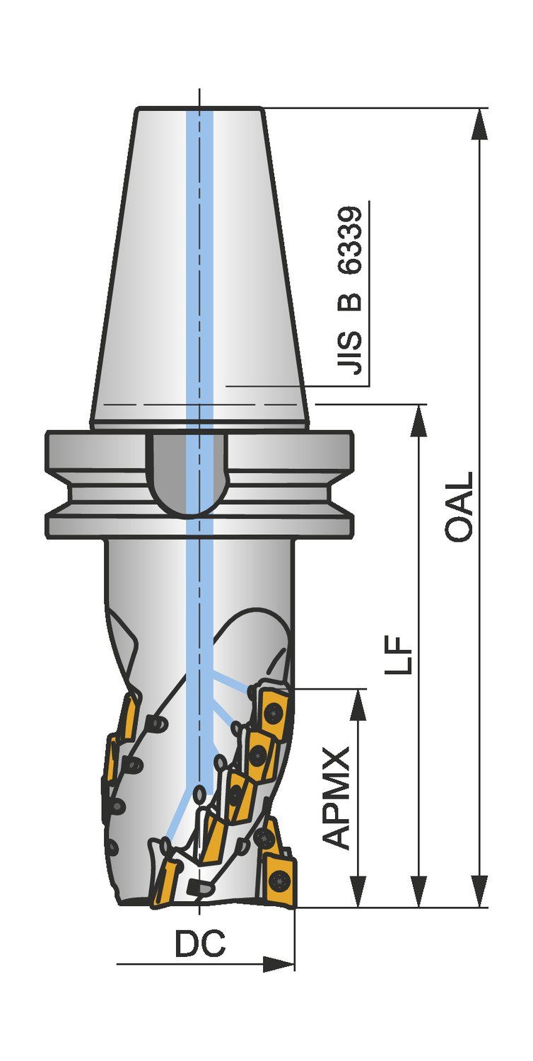 Shoulder mill with extended flute with positve/negative geometry which utilises 18 off ADMX 16 or ADEX 16 single-sided inserts, cutting diameter 63mm with 90° approach angle and BT 50 taper shank according to JIS B 6339, 80mm functional and 257mm overall length, through coolant for deep shoulder milling and deep slot milling with a maximum depth of cut of 80mm