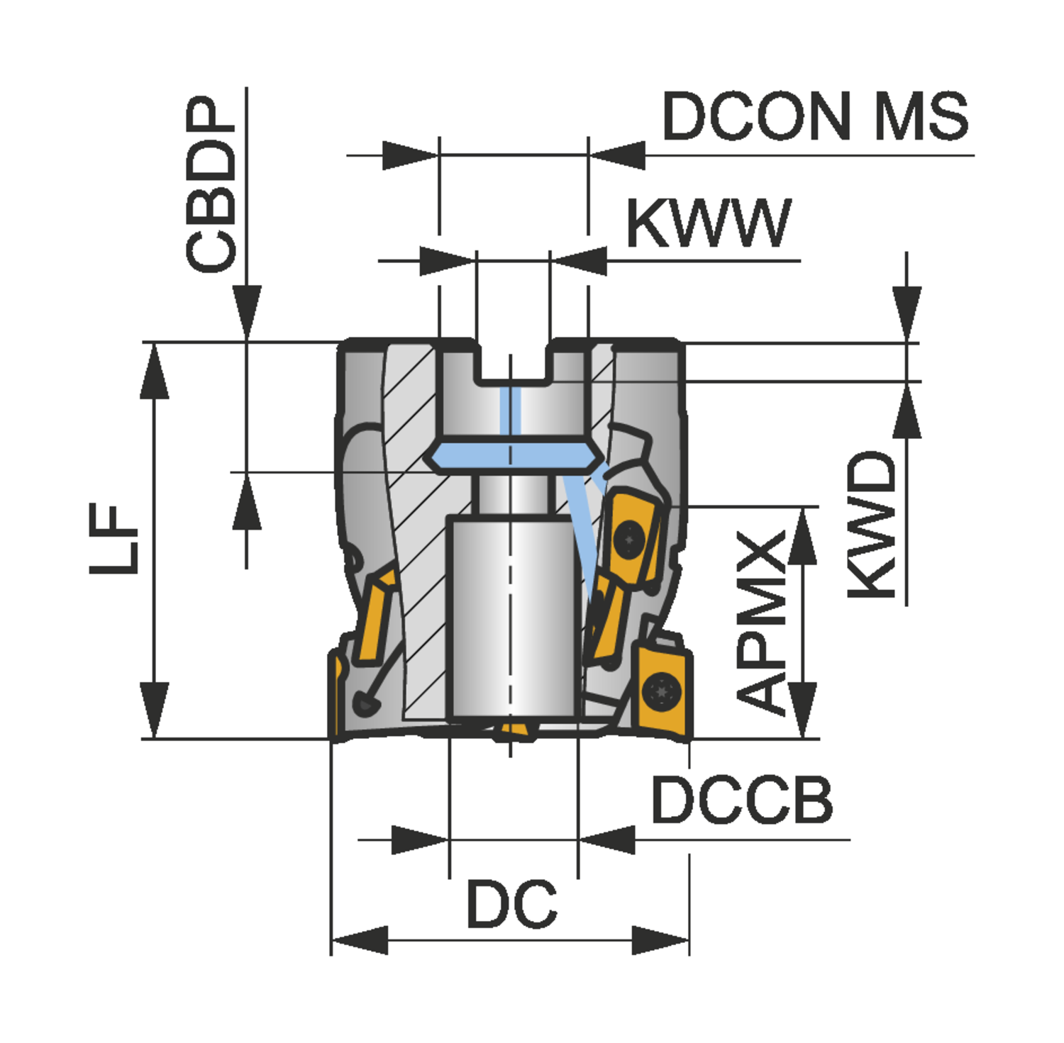 Shoulder mill with extended flute with positve/negative geometry which utilises 12 off ADMX 16 or ADEX 16 single-sided inserts, cutting diameter 63mm with 90° approach angle and 27mm connection bore according to DIN 8030, 40mm functional and 70mm protrusion length, through coolant and differential pitch for deep shoulder milling and deep slot milling with a maximum depth of cut of 40mm