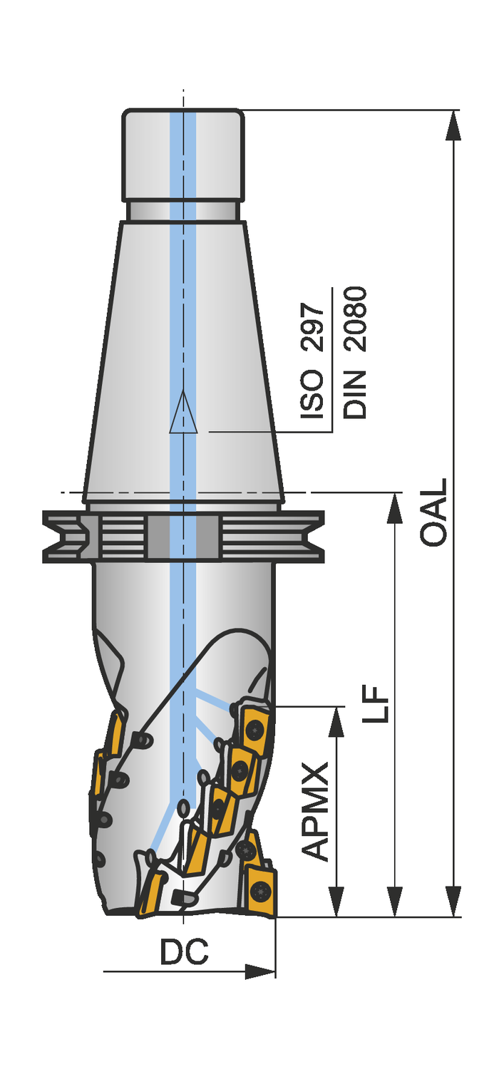 Shoulder mill with extended flute with positve/negative geometry which utilises 32 off ADMX 16 or ADEX 16 single-sided inserts, cutting diameter 80mm with 90° approach angle and SK 50 taper shank according to ISO 297, 108mm functional and 292mm overall length, through coolant and differential pitch for deep shoulder milling and deep slot milling with a maximum depth of cut of 108mm
