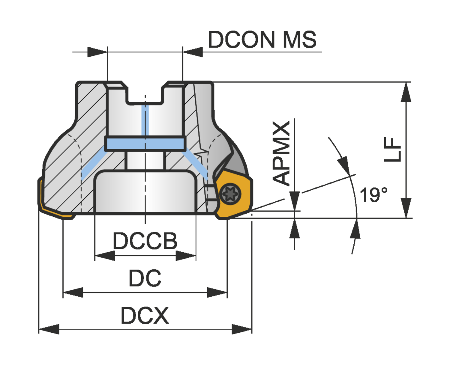High feed cutter with positve/negative geometry which utilises 5 off PD.X 09, PDKT 09 or PDMW 09 single-sided inserts, cutting diameter 2.500'' with 19° approach angle and .750'' connection bore according to DIN 8030-A, 1.575'' protrusion length, through coolant for face milling with a maximum depth of cut of .079''