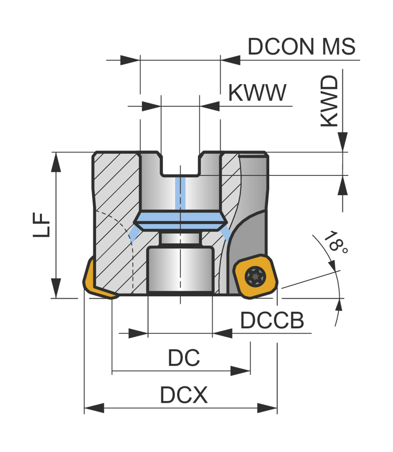 High feed cutter with double negative geometry which utilises 6 off SNGX 1104.. double-sided inserts, cutting diameter 66mm with 18° approach angle and 27mm connection bore according to DIN 8030-C, 50mm protrusion length, through coolant and differential pitch for face milling, copy milling, ramping, helical milling, plunge milling and progressive plunge milling with a maximum depth of cut of 1.7mm