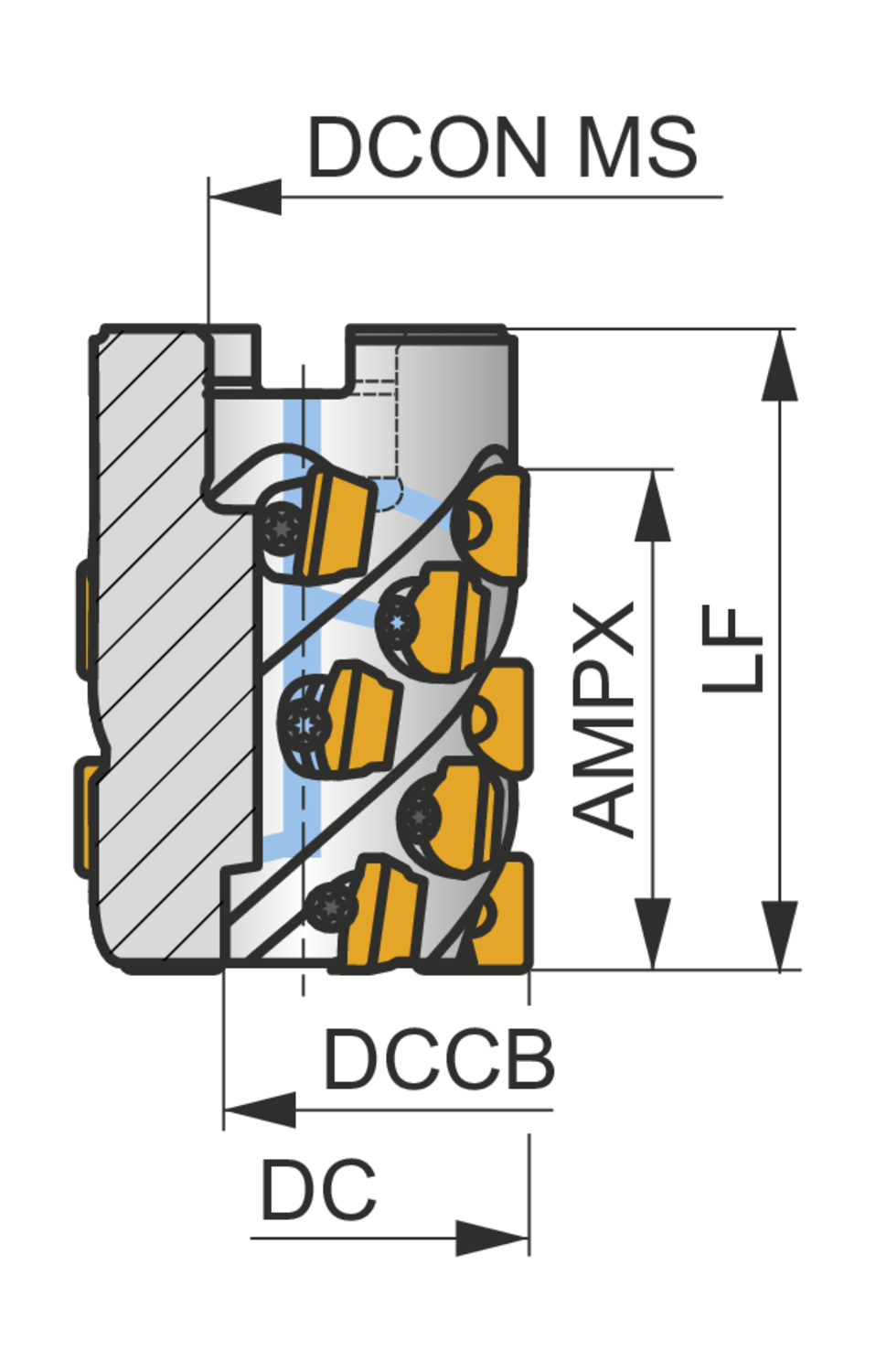 Shoulder mill with extended flute with positve/negative geometry which utilises 25 off SDGX 12 or SDMX 12 single-sided inserts, cutting diameter 50mm with 90° approach angle and 22mm connection bore according to DIN 8030, 78mm protrusion length for deep shoulder milling and deep slot milling with a maximum depth of cut of 54,9mm