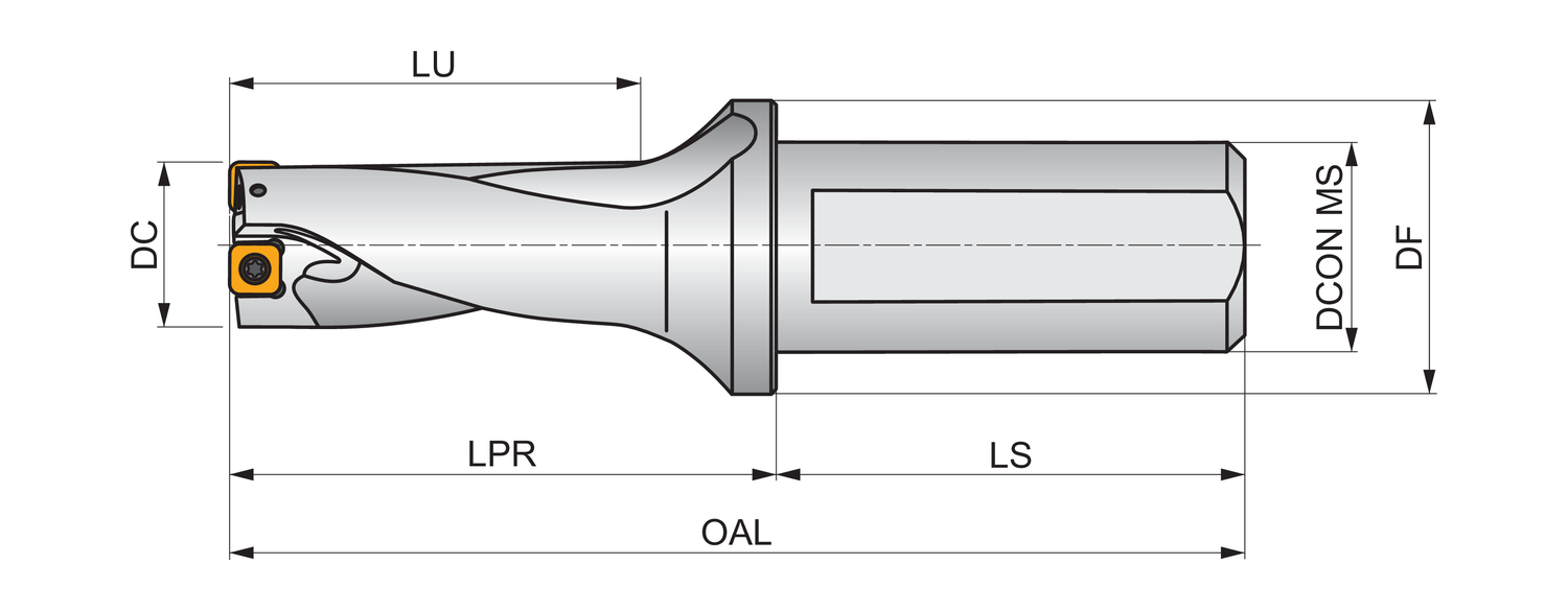Indexable insert drill which utilises an XPET 12T3.. insert in the central pocket and a SCET 1204.. insert in the peripheral pocket, cutting diameter 1.750'', with a 1.500'' cylindrical shank with flat according to ISO 9766 and through coolant for maximum drilling depths up to 2 x D