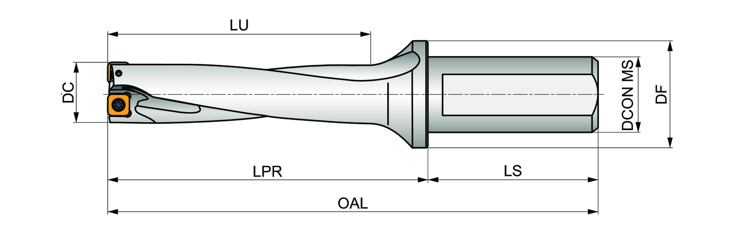 Indexable insert drill which utilises an XPET 0502.. insert in the central pocket and a SCET 0502.. insert in the peripheral pocket, cutting diameter 0.625'', with a 1.000'' cylindrical shank with flat according to ISO 9766 and through coolant for maximum drilling depths up to 4 x D