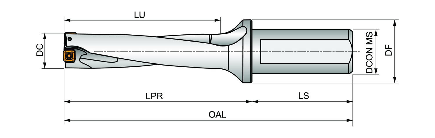 Indexable insert drill which utilises an XPET 0703.. insert in the central pocket and a SCET 0703.. insert in the peripheral pocket, cutting diameter 26mm, with a 32mm cylindrical shank with flat according to ISO 9766 and through coolant for maximum drilling depths up to 4 x D