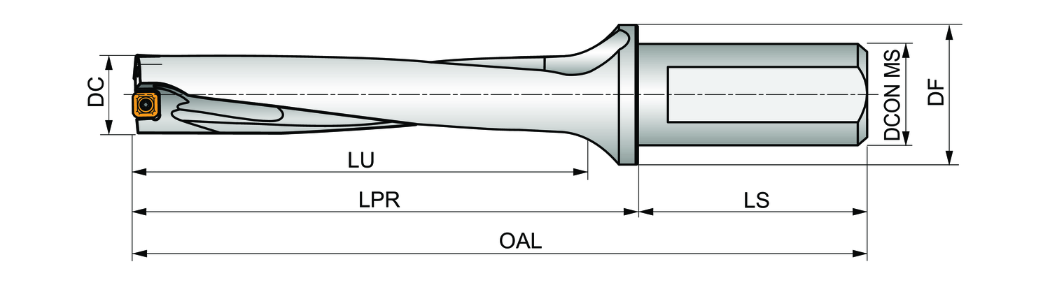 Indexable insert drill which utilises an XPET 0703.. insert in the central pocket and a SCET 0703.. insert in the peripheral pocket, cutting diameter 24mm, with a 25mm cylindrical shank with flat according to ISO 9766 and through coolant for maximum drilling depths up to 5 x D