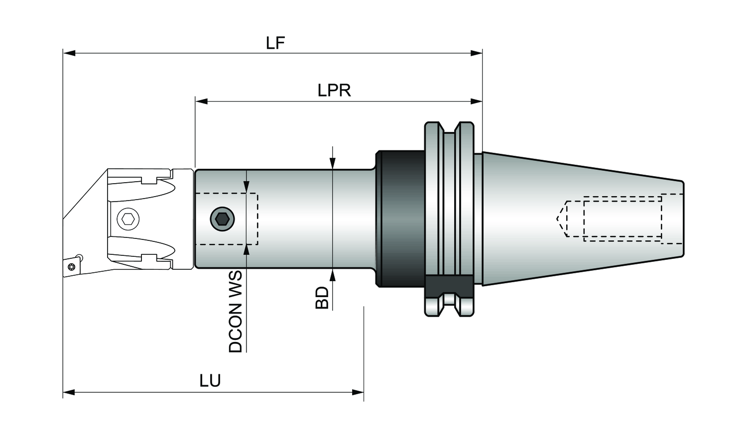 Tool shank for modular boring system sizes 100 and 200 with (DIN 69871) SK 50 taper shank according to ISO/DIS 7388-1, through coolant feed and 260 protrusion length (including the boring head )