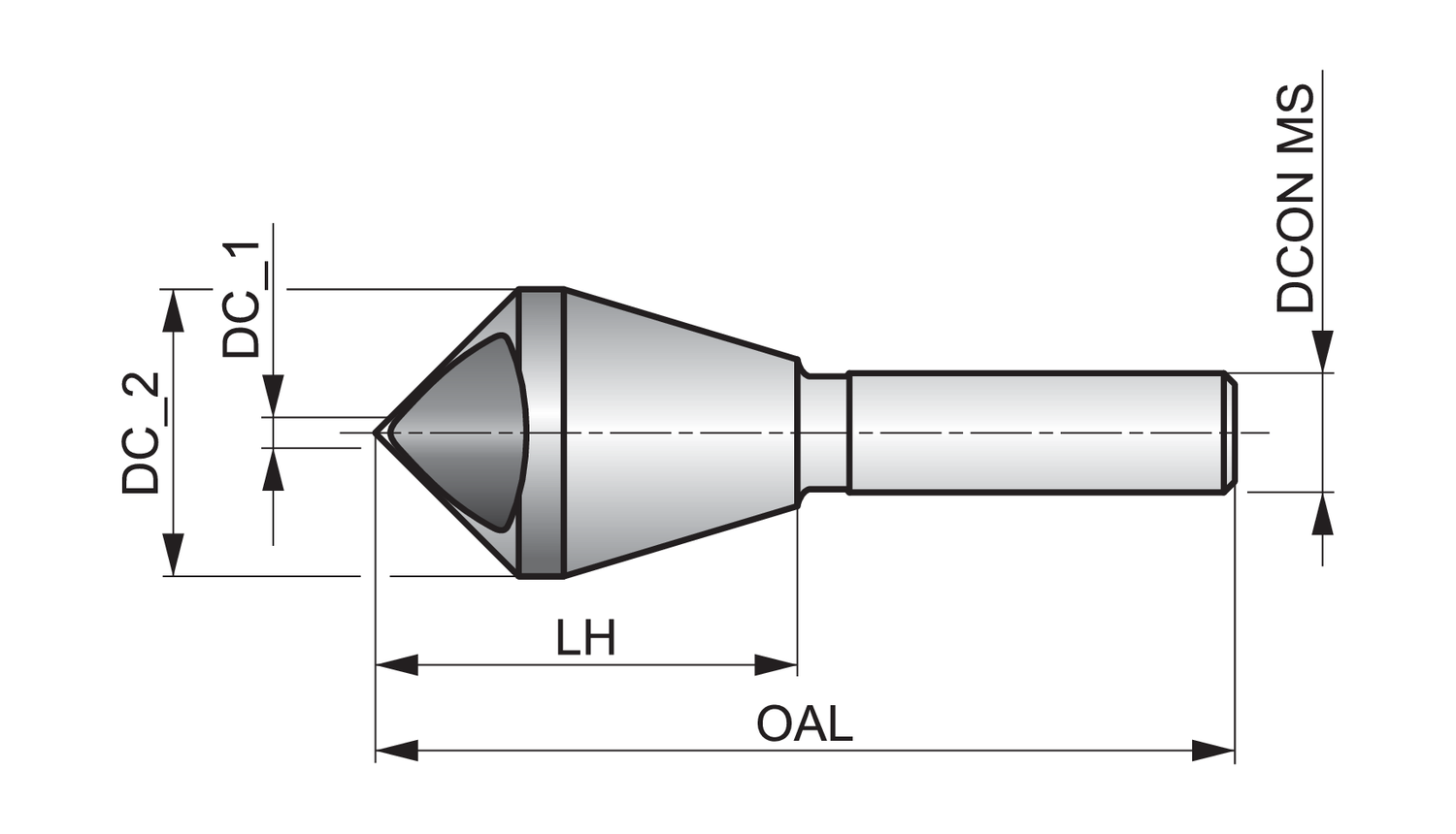Zero flute countersink, through hole style, with 1-cutting edge, 90° chamfering angle, maximum diameter 25.00mm with an overall length of 102mm and a head length of 48mm and 15mm straight shank, according to DORMER standard to produce a conical seat for ISO Metric countersunk-head screws with a minium hole diameter of 20.00mm, cobalt based HSS-E with standard bright finish for machining free machining, plain carbon and alloy steel, wrought and copper or copper alloys.