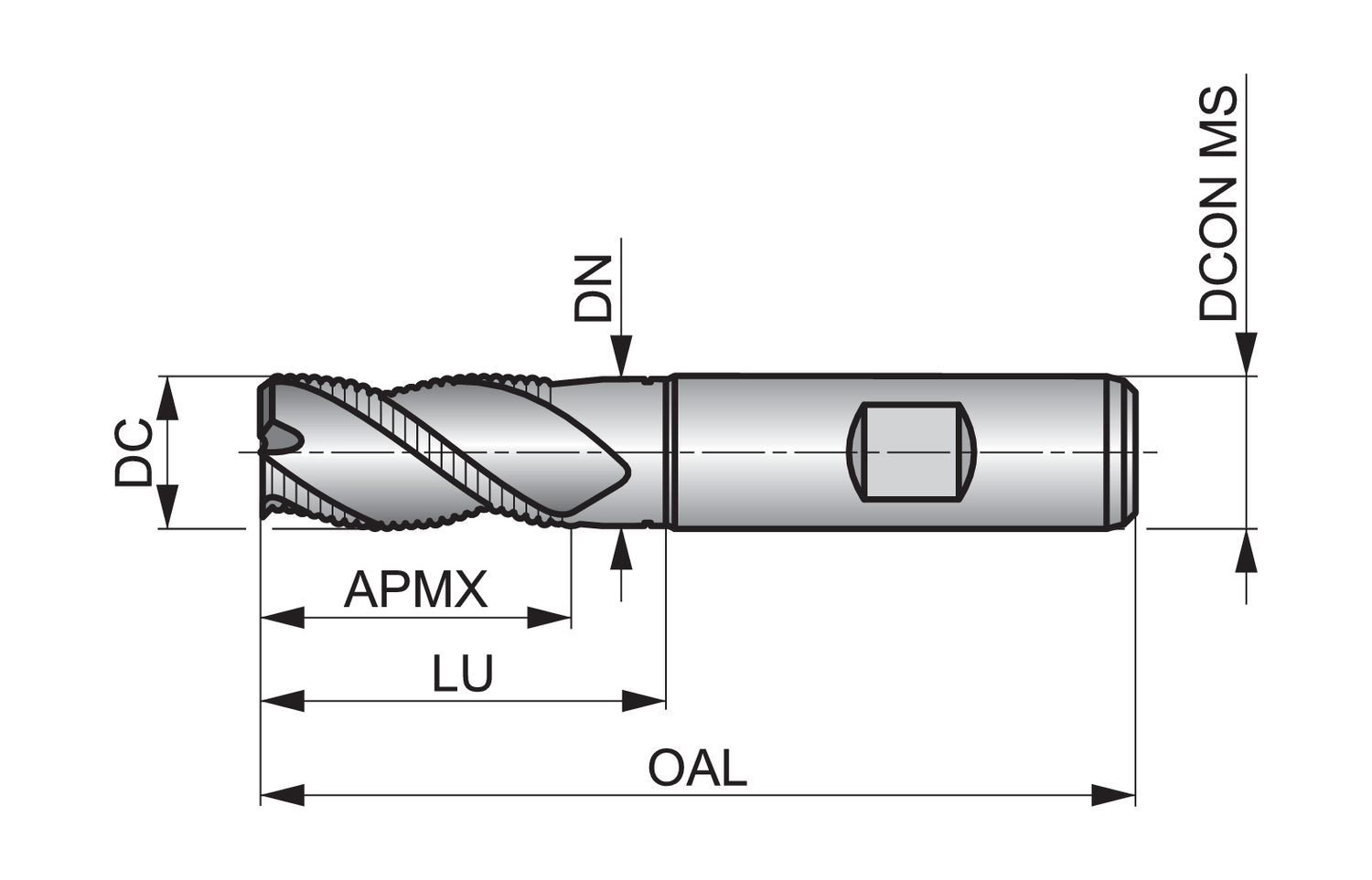 This breaks up the chips for efficient roughing application and is suitable for milling steels, stainless steels and cast iron