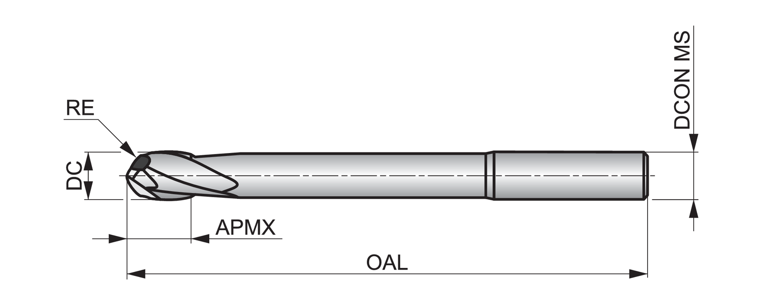 S215 2-flute ball nose milling cutters can be used for plunging, ramping and profile milling in steel, stainless steels and cast iron