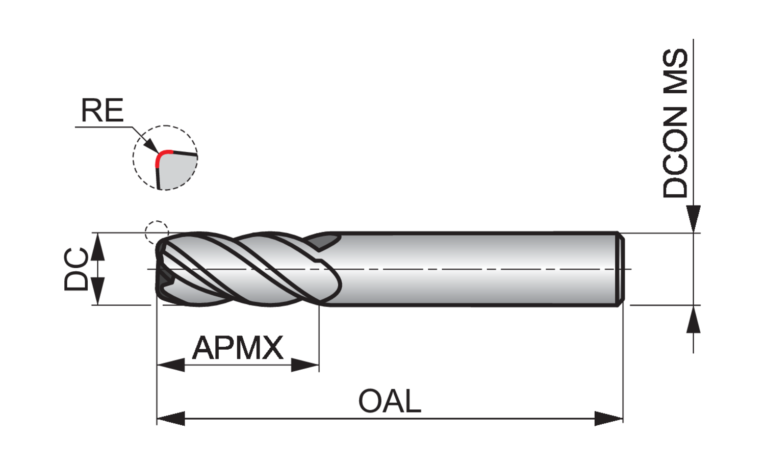 S523 corner radius end mills have a 40 degree helix for high performance profiling on CNC machines and are designed specifically for high speed machining in hardened tool steels up to 63HRC