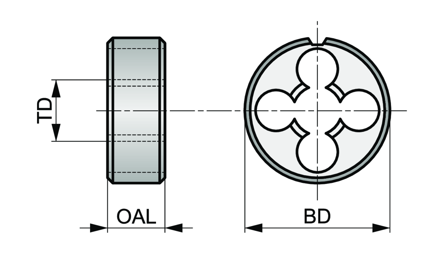 Solid round die with a gun nose, for ISO-Metric thread M14 with 2.00 mm pitch and 6g class of fit, dimensions according to ISO 2568 standard with 38mm outside diameter and 14mm thickness, HSS with lapped surface finish for threading in free machining and plain carbon steel, ferritic stainless steel and gray, malleable, ductile and compacted graphite cast-iron.