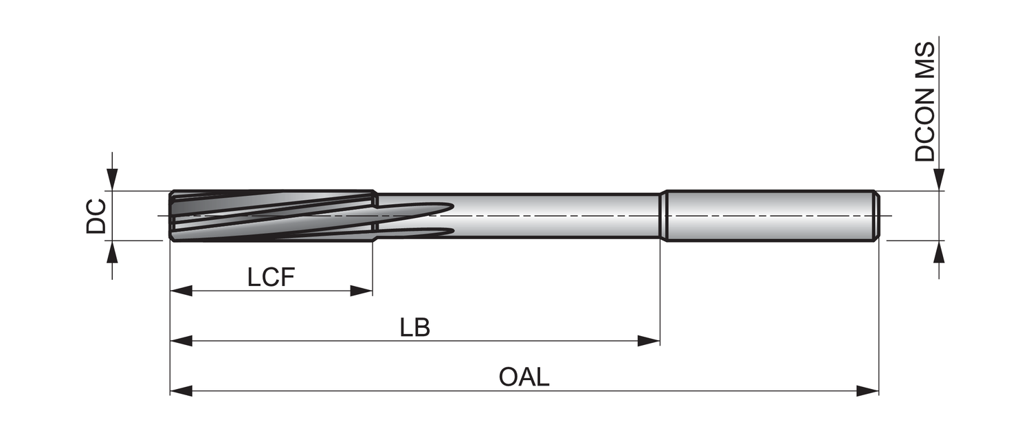 Centesimal reamer with left hand slow spiral flutes which are extremely unequally spaced and a cylindrical shank, diameter 8.03mm with an overall length of 117mm, a flute length of 33mm and 81mm reach with neck relief, according to DIN 8093 standard with a diameter tolerance of 0/+0.005mm to produce holes within diameter-tolerance 8F9, carbide head with bright finish for machining free machining, plain carbon, alloy and tool steel, grey, malleable, ductile and compacted graphite cast-iron, wrought and cast aluminium and copper or copper alloys.