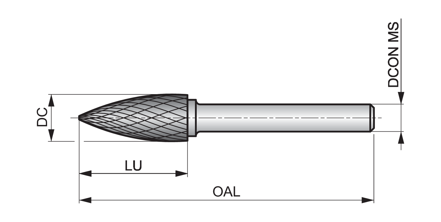 The DC geometry on the burr breaks chips more effectively and improves control when de-burring by hand, whilst the toughened and hardened steel shank makes the tool stronger and more rigid to reduce vibration and so extend the life of the tool.