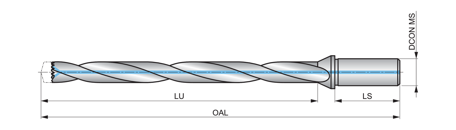 DOR Replaceable head drill body HYDRA with cylindrical shank with flange, size 22.0mm with an overall length of 343mm and flute length of 264mm according to DORMER standard for 12xD drilling with HYDRA P (R950), HYDRA M (R960) or HYDRA K (R970) diameter 21.83 up to 22.7mm