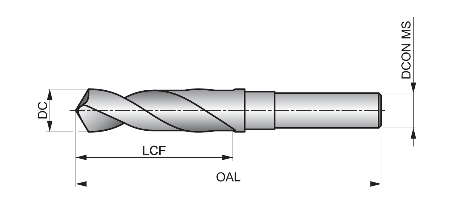R58 silver and deming drill bits have a reduced 3/4 inch parallel shank on all diameters so you can use large diameter drills in hand held power tools. They have a conventional 118 degree point angle, providing a strong point which is easy to re-grind.